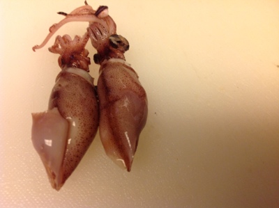右はそのままのホタルイカ。左は目、口、甲羅を取り除いて下足の先を切ってあります。