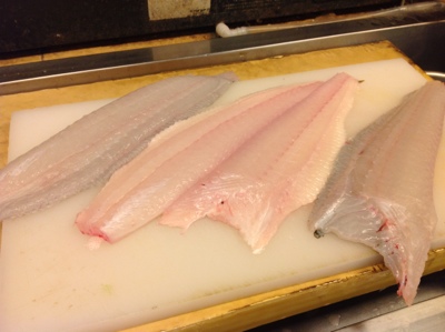 こんな感じになります。最近は金たわしで取る人もいますが、後で皮が引きにくいんです。鱗を取ったら頭を落とし内臓を取り出して5枚におろします。通常の魚は3枚おろしですが平目やカレイなどの魚は中骨と身を4枚で5枚おろしになります。
