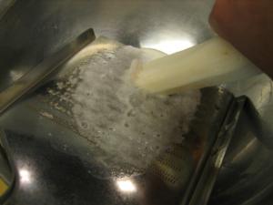 皮をむいて半分すりおろします。あくが出ると黒くなるんで注意。大抵、あくの出そうなのはわかります。皮が固いんです。なるべく皮の柔らかいものを使います。