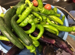 胡瓜、ミニトマト、長茄子、十六ささげ。