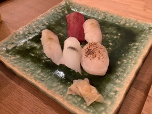 先ずは、本鮪赤身、真鯛(風間水産)、こち(風間水産)、モンゴイカ(風間水産)、ホタテ