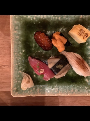 いくら醤油漬け、羅臼ウニ、鰹、蒸し鮑、穴子、歩荷さんの卵焼き