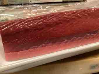 普段はキハダマグロには見向きもしませんが徳島で上がった近海物。脂物だというので見せてもらいましたがこれはいい。